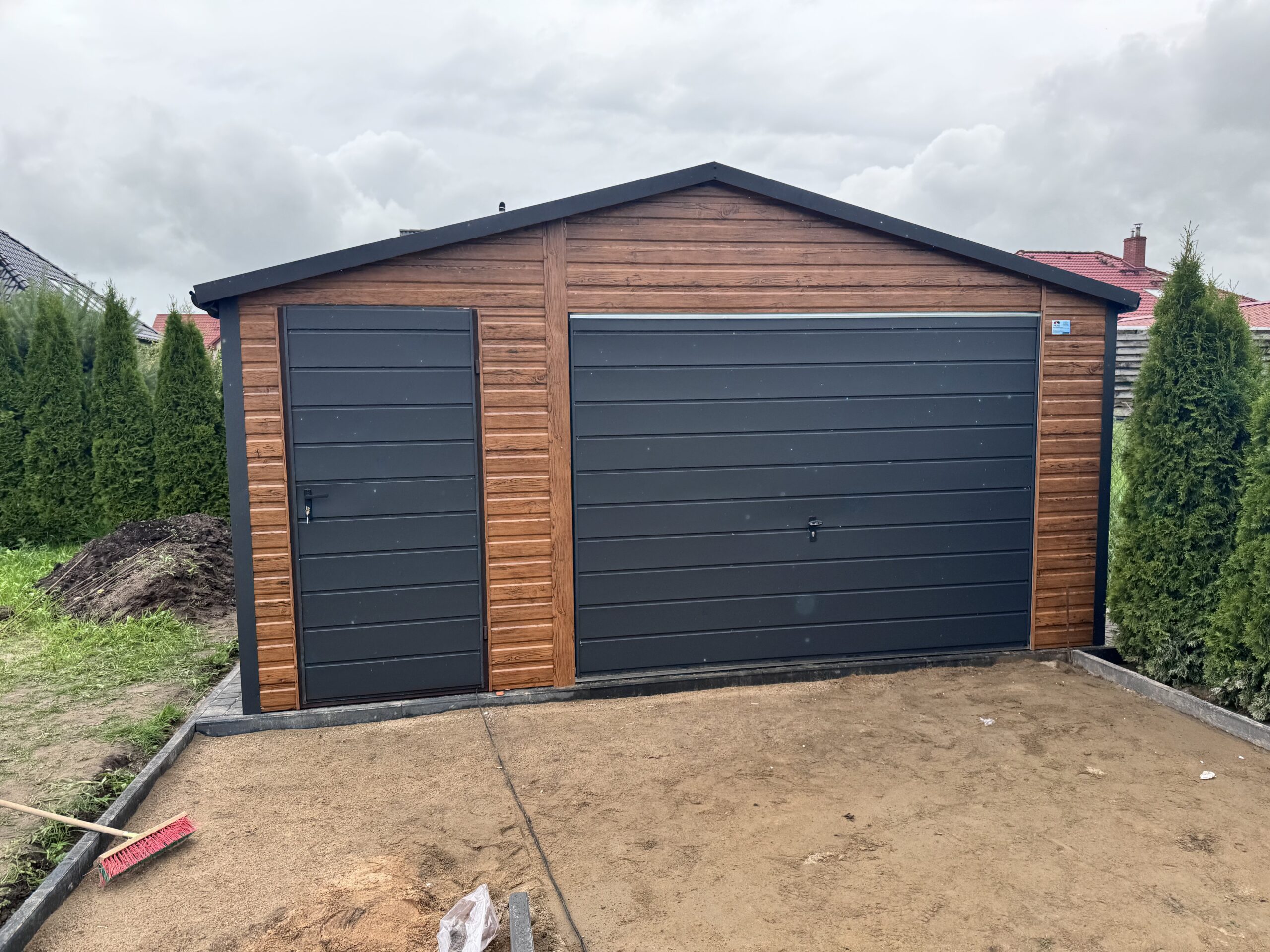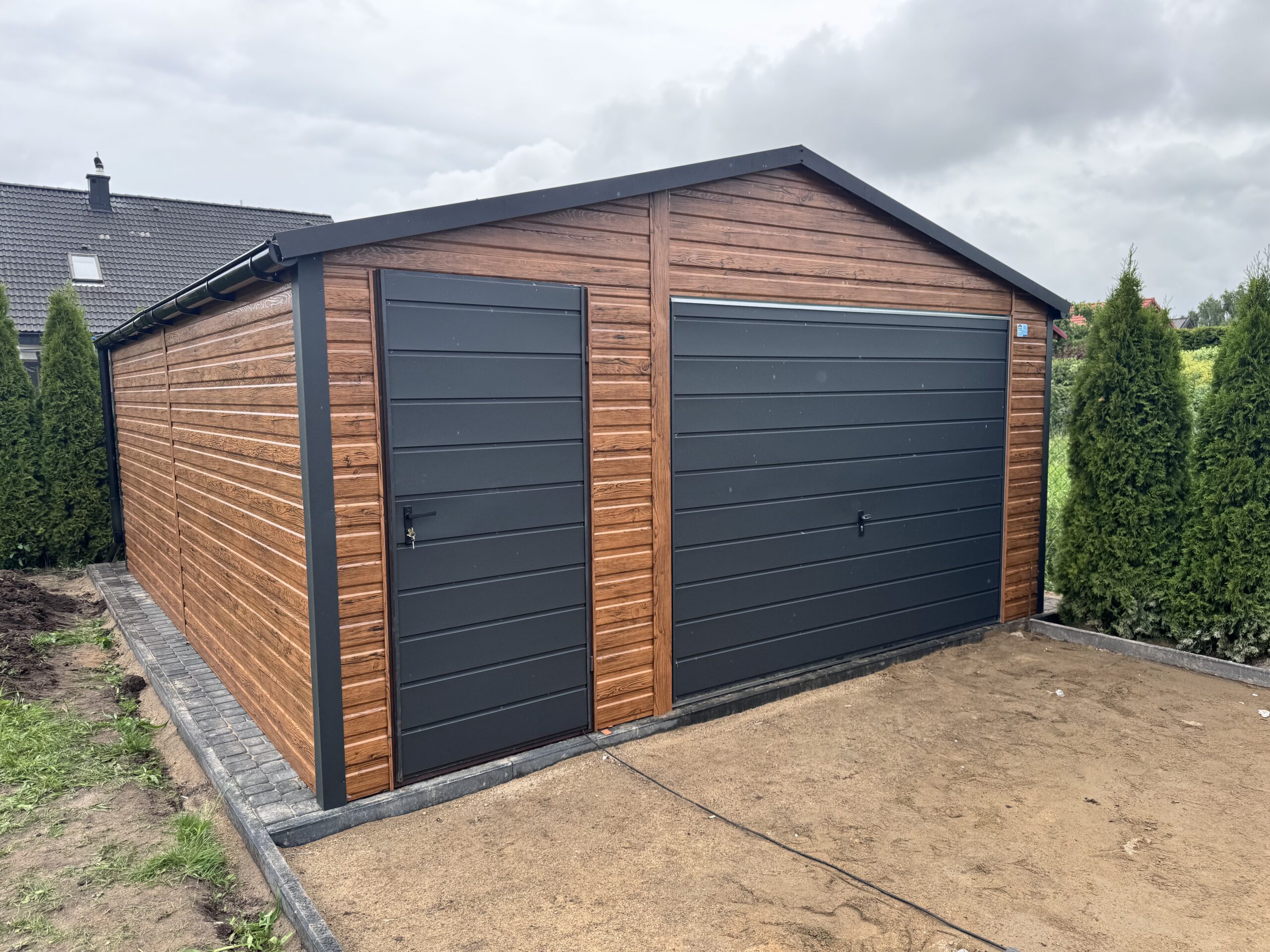 Prezentujemy garaż blaszany o wymiarach 5×5 m z dachem dwuspadowym, który wyróżnia się eleganckim pokryciem z blachodachówki. To zgrabna i bardzo estetyczna konstrukcja, idealna na jeden samochód oraz dodatkowy sprzęt. Szkielet z ocynkowanych profili zamkniętych gwarantuje odporność na warunki atmosferyczne i długą żywotność. Połączenie drewnopodobnego złotego dębu z grafitowymi akcentami sprawia, że garaż prezentuje się wyjątkowo nowocześnie. W standardzie otrzymujesz pełne obróbki blacharskie dachu i narożników.