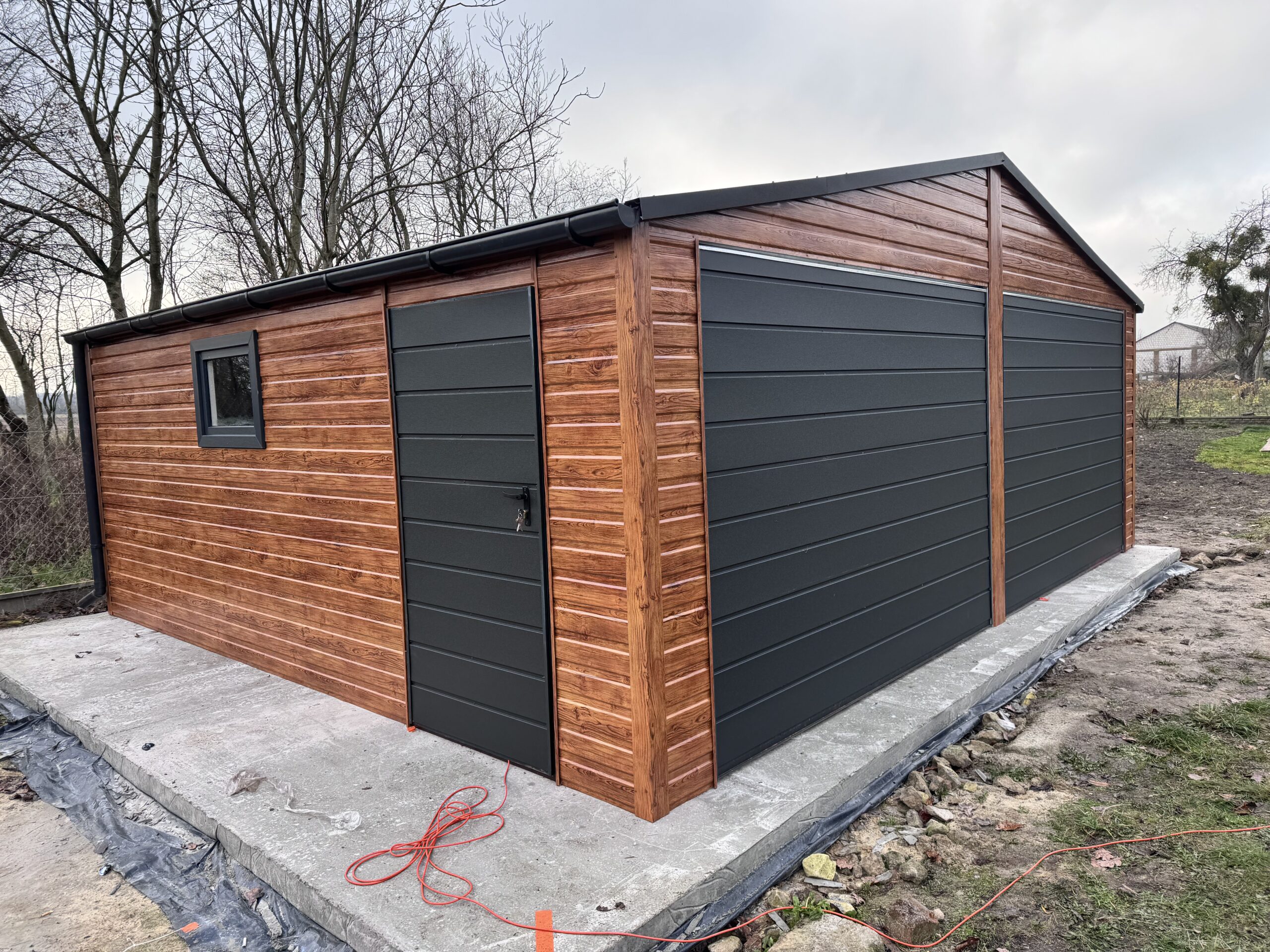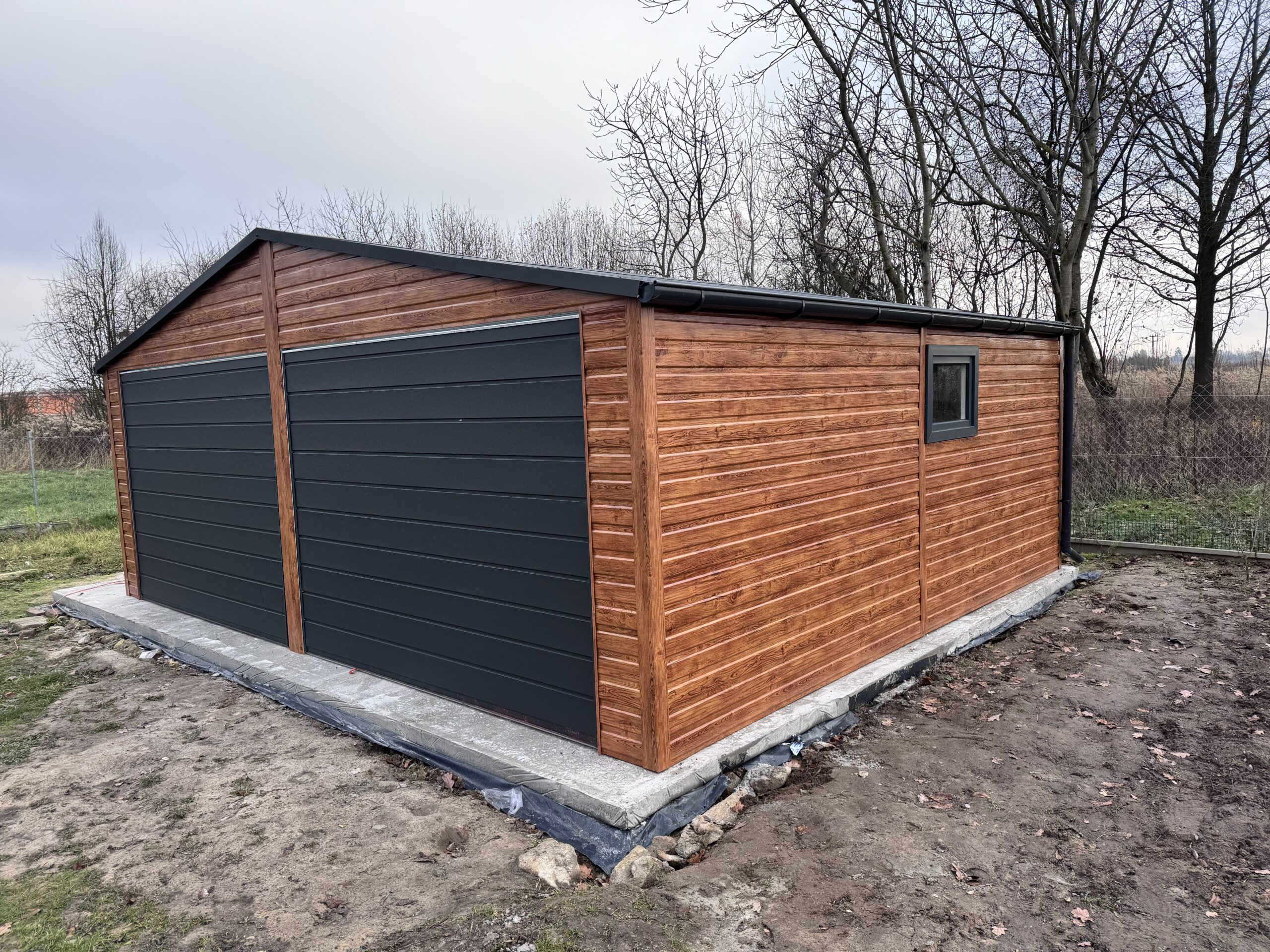 Prezentujemy garaż blaszany o wymiarach 7×5 m z dachem dwuspadowym, będący bardzo dobrym wyborem na dwa stanowiska parkingowe. Szkielet garażu w całości oparty jest na solidnych profilach zamkniętych, co gwarantuje maksymalną stabilność i wieloletnią trwałość. Konstrukcja wyróżnia się estetycznym wykończeniem – łączy w sobie nowoczesny antracyt ze wstawkami w kolorze złotego dębu. W standardzie zapewniamy okucia narożne i dachowe.