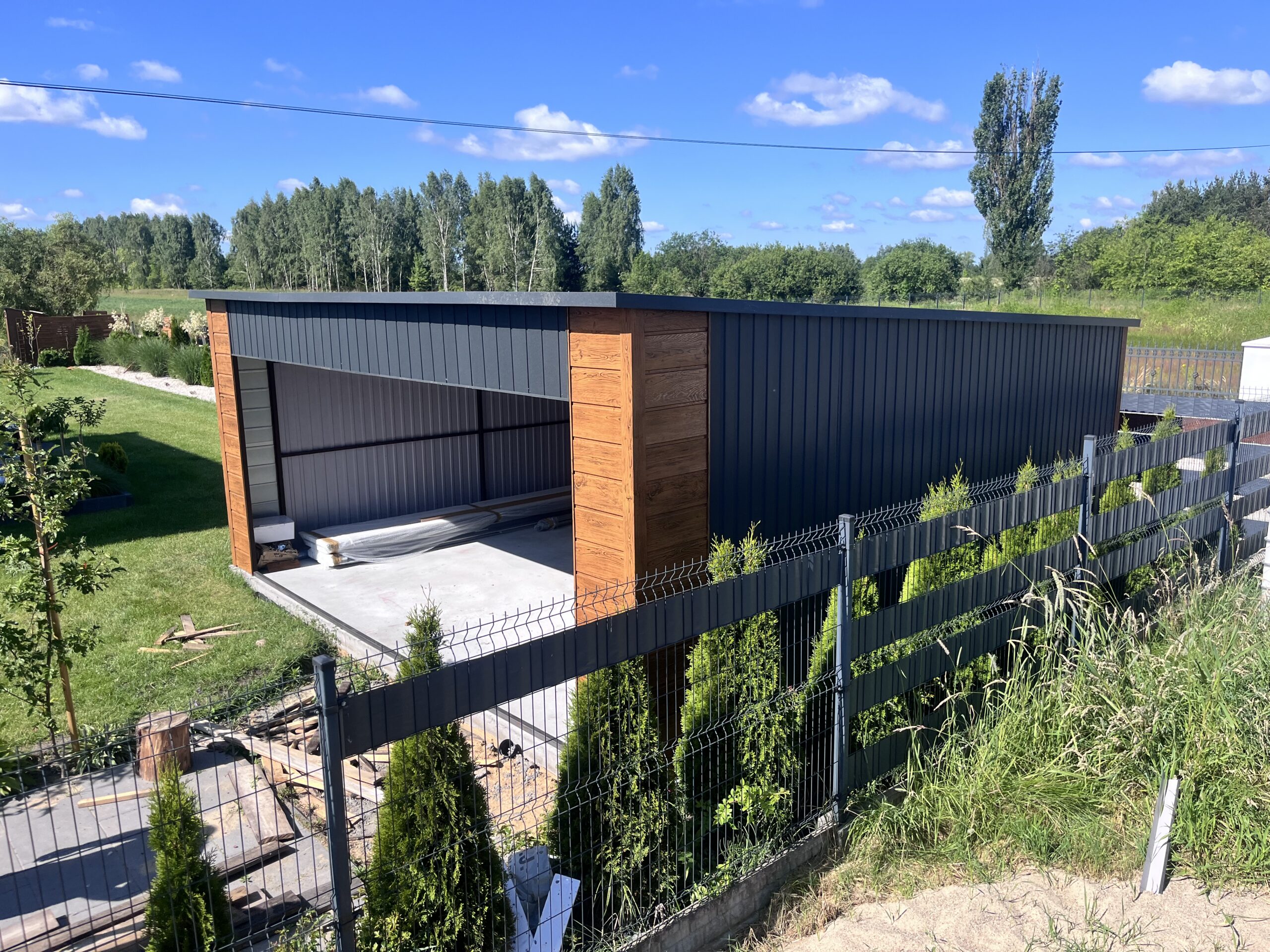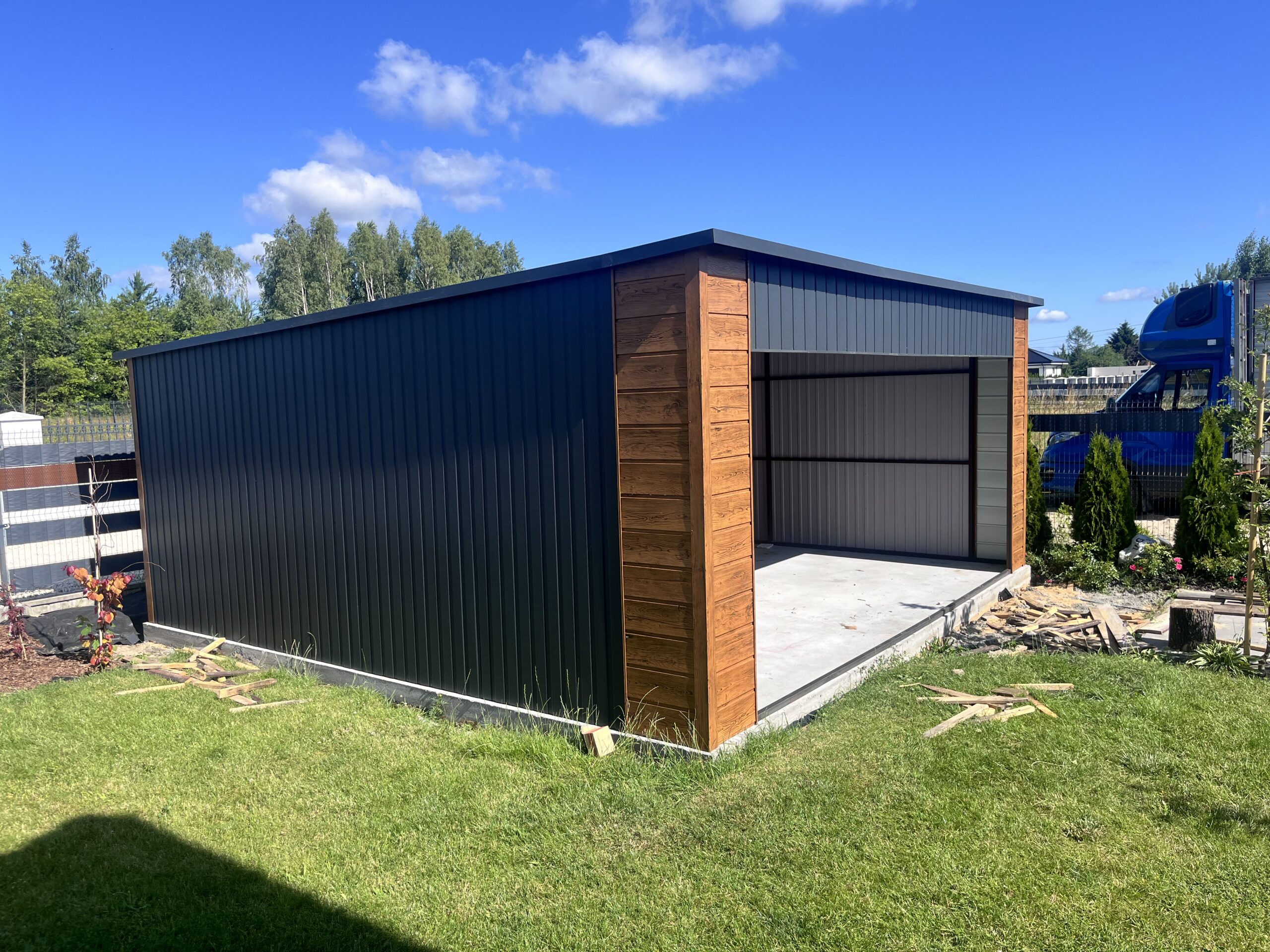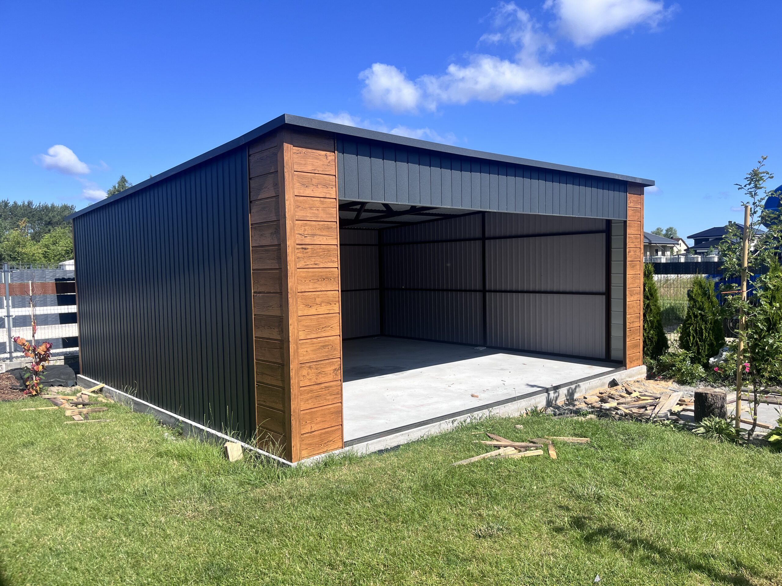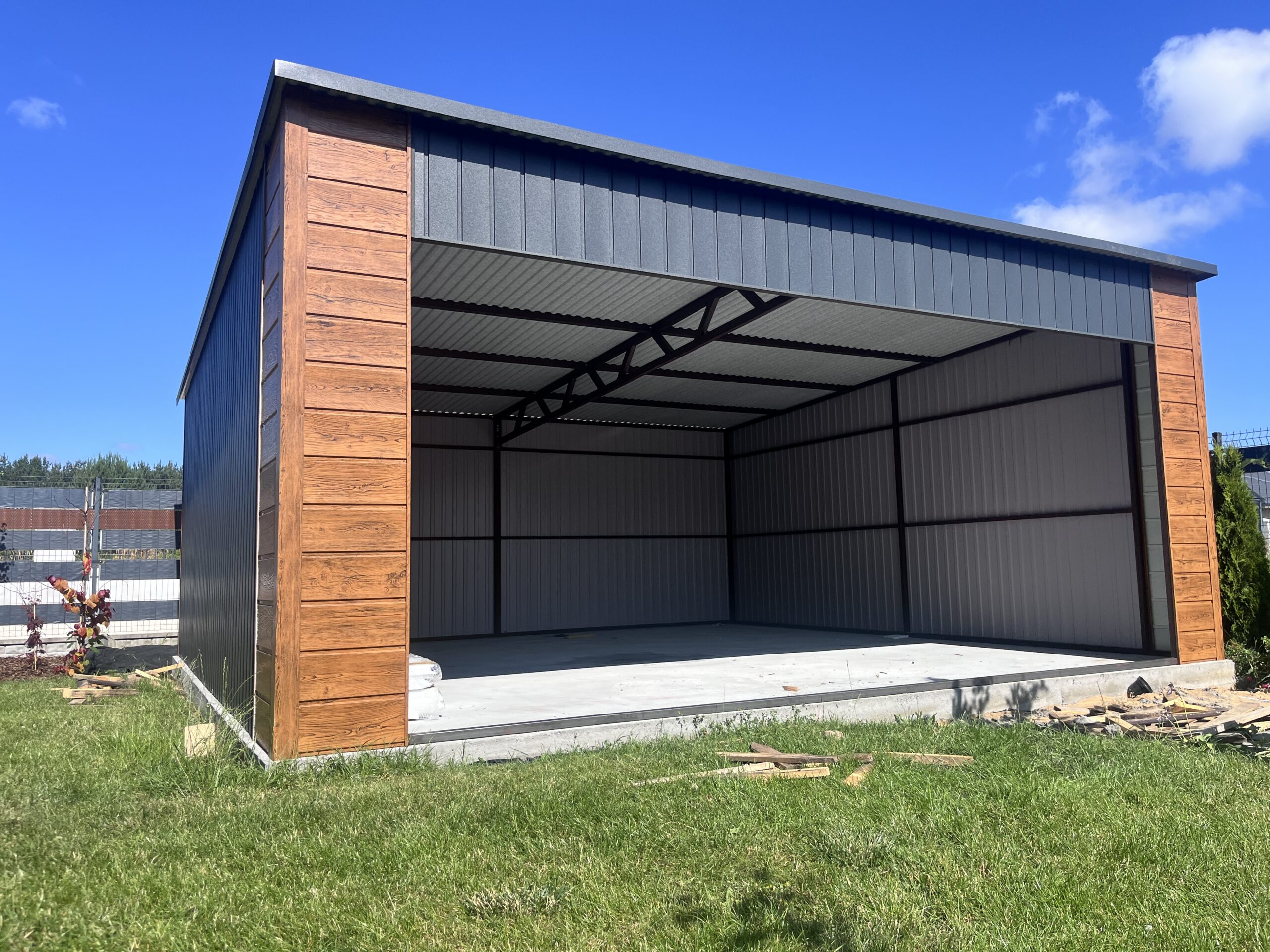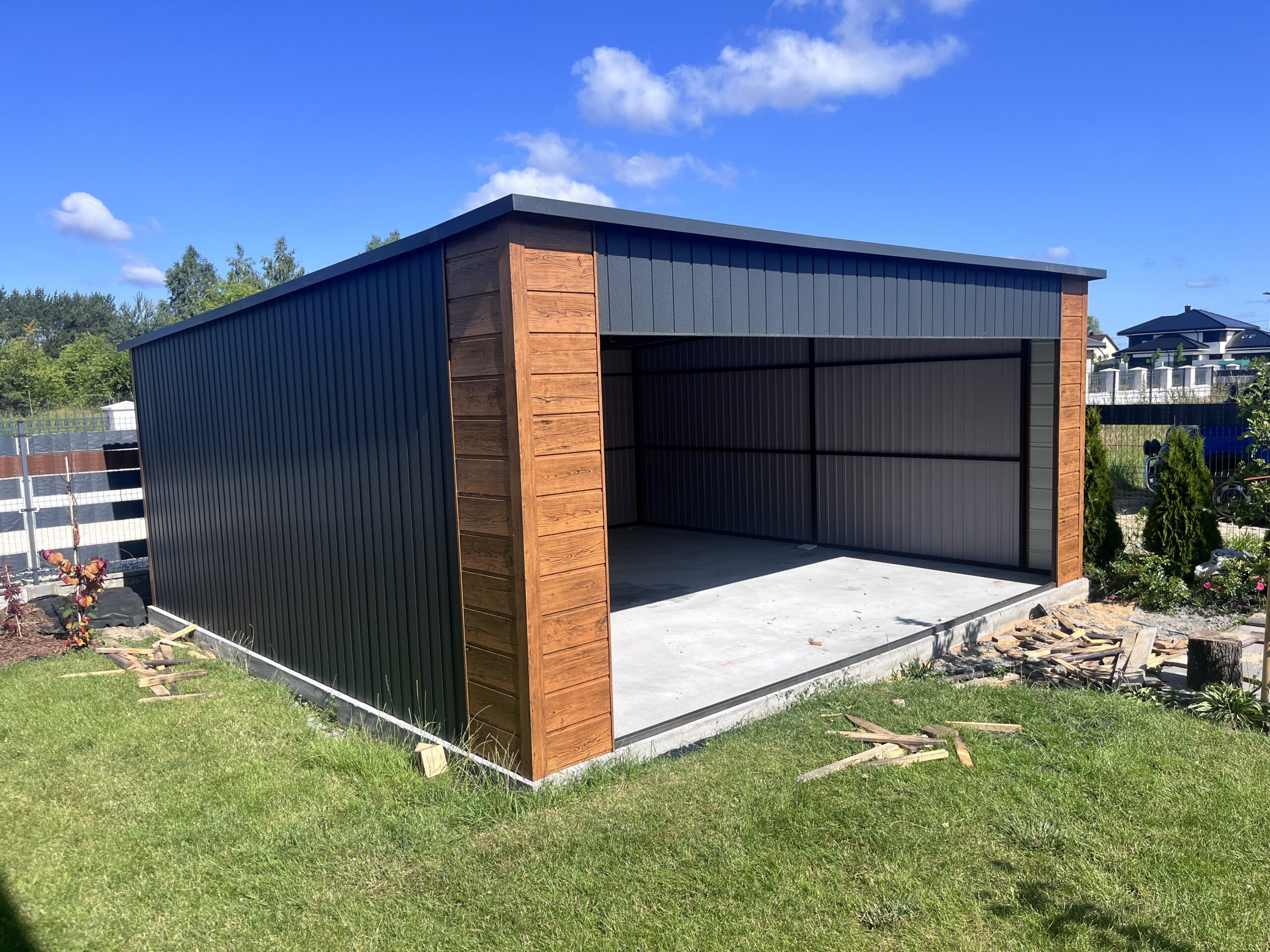 Prezentujemy wiatę blaszaną z otwartym frontem o wymiarach 6×5,80 m i dachem ze spadem na tył. To niezwykle praktyczne rozwiązanie, idealne do ochrony pojazdów lub sprzętu przed warunkami atmosferycznymi. Solidny szkielet z ocynkowanych profili zamkniętych to gwarancja stabilności i wieloletniej trwałości. Nowoczesny grafit przełamany ciepłym, drewnopodobnym złotym dębem nadaje całości bardzo estetyczny wygląd. W standardzie oferujemy pełne obróbki blacharskie dachu i narożników.